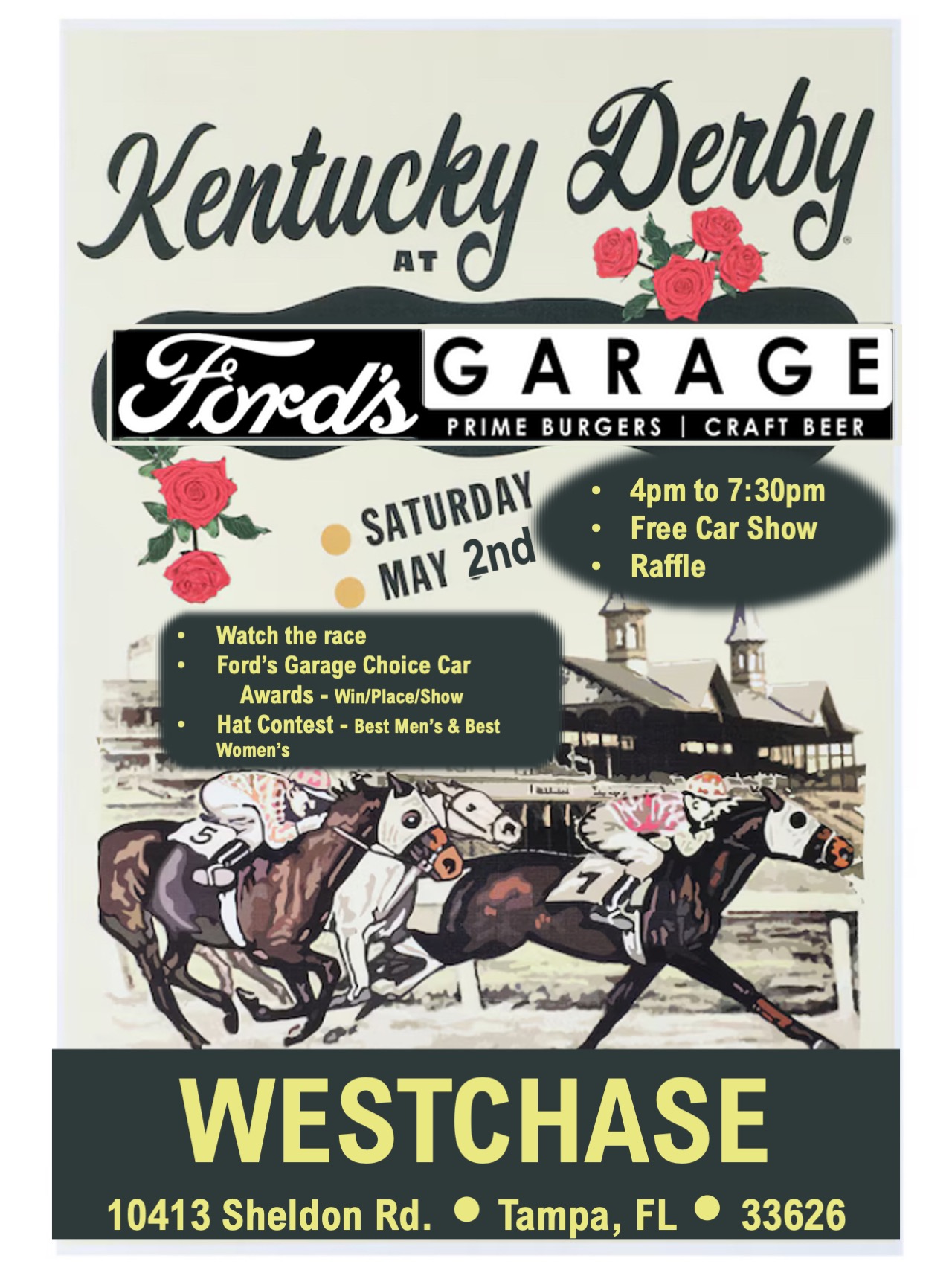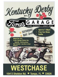 Join us for an exciting Kentucky Derby celebration at Ford’s Garage Westchase on Saturday, May 2nd from 4:00 PM to 7:30 PM.